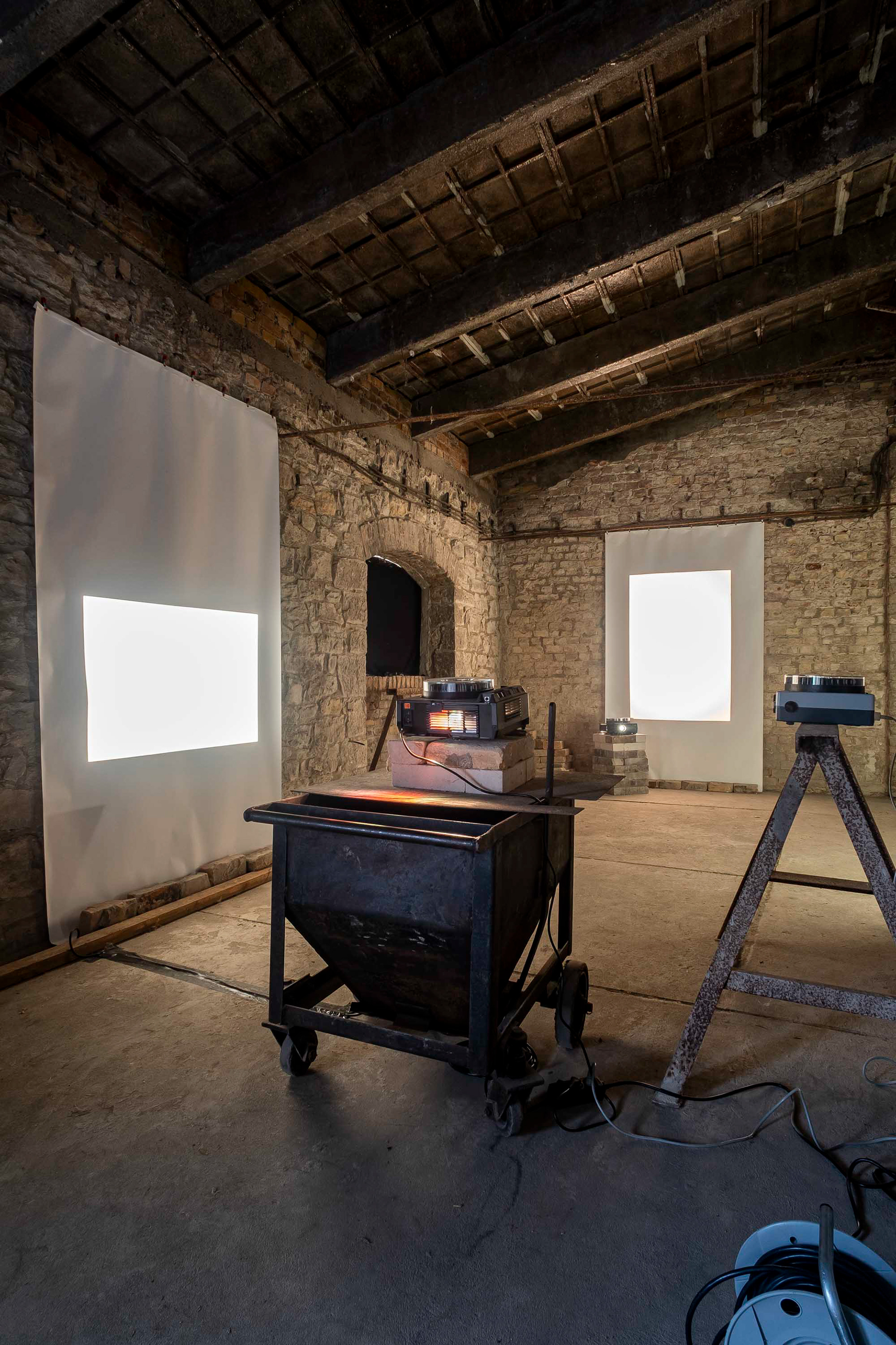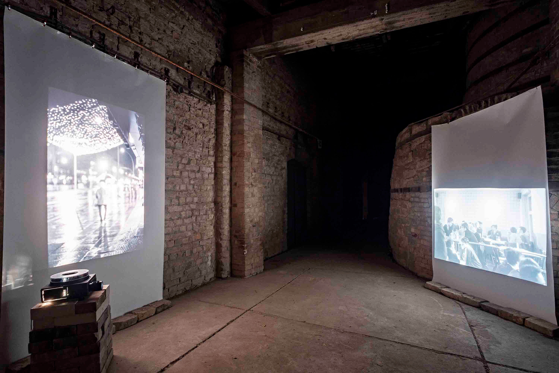 Without Places is a photographic series that uses multiple slide projectors in a continuous loop and rotation to explore the question of places and their significance. White, grey, black and completely blank slides are interspersed between the motifs. The motifs themselves show scenes of Berlin nightlife from across the city, without any specific location characteristics. The installation took place at the Museumspark Rüdersdorf industrial monument, a former lime works on the outskirts of Berlin.